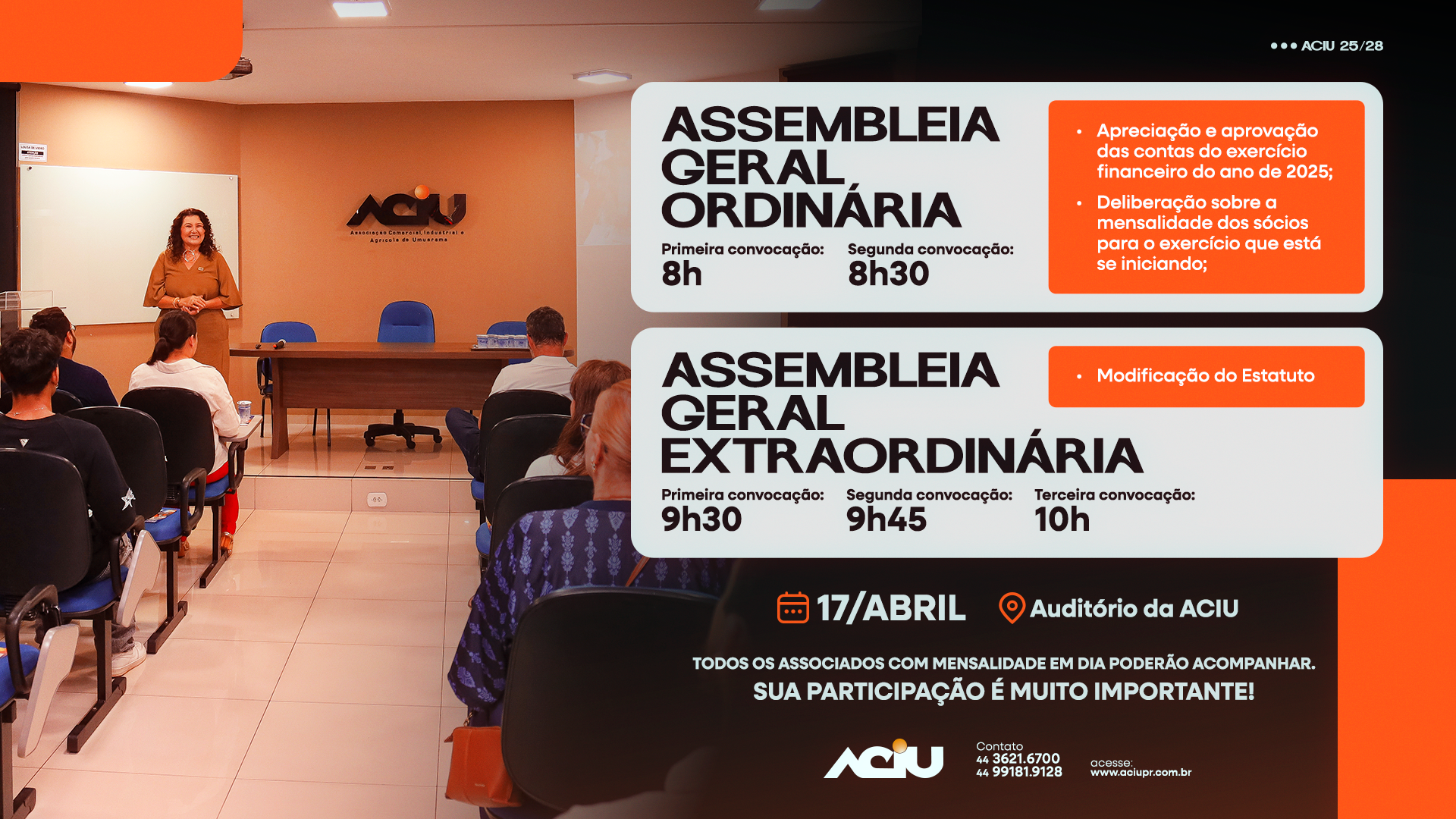 A Aciu (Associação Comercial, Industrial e Agrícola de Umuarama) convida associados para assembleias que serão realizadas no dia 17 de abril, na sede da entidade.