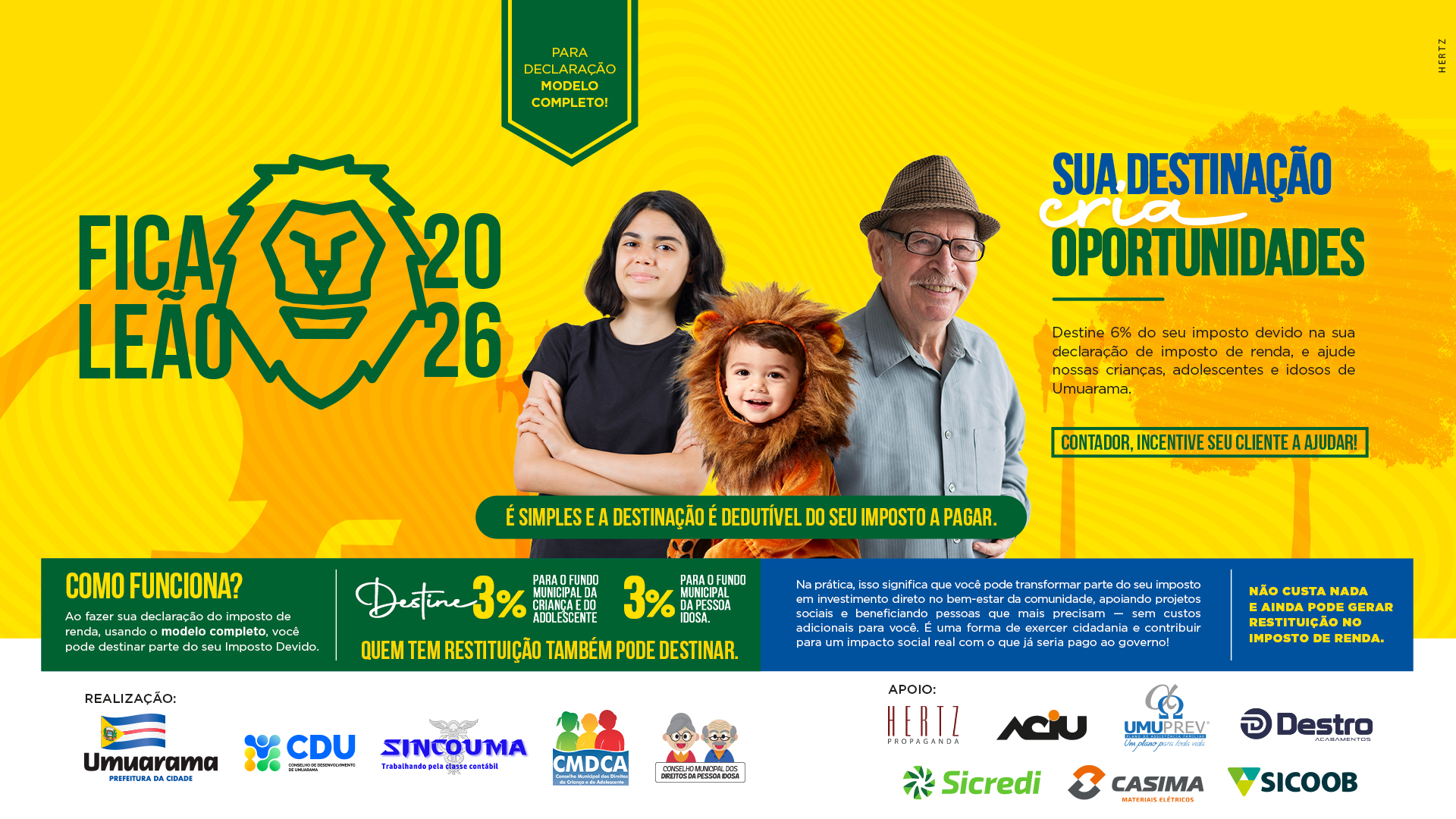 O CDU (Conselho de Desenvolvimento de Umuarama) está à frente de mais uma edição da campanha Fica e Leão e orienta contribuintes, que fazem a declaração do imposto de renda, usando o modelo completo, a destinar parte do imposto devido para o Fundo Municipal da Criança e do Adolescente e o Fundo Municipal da Pessoa Idosa.