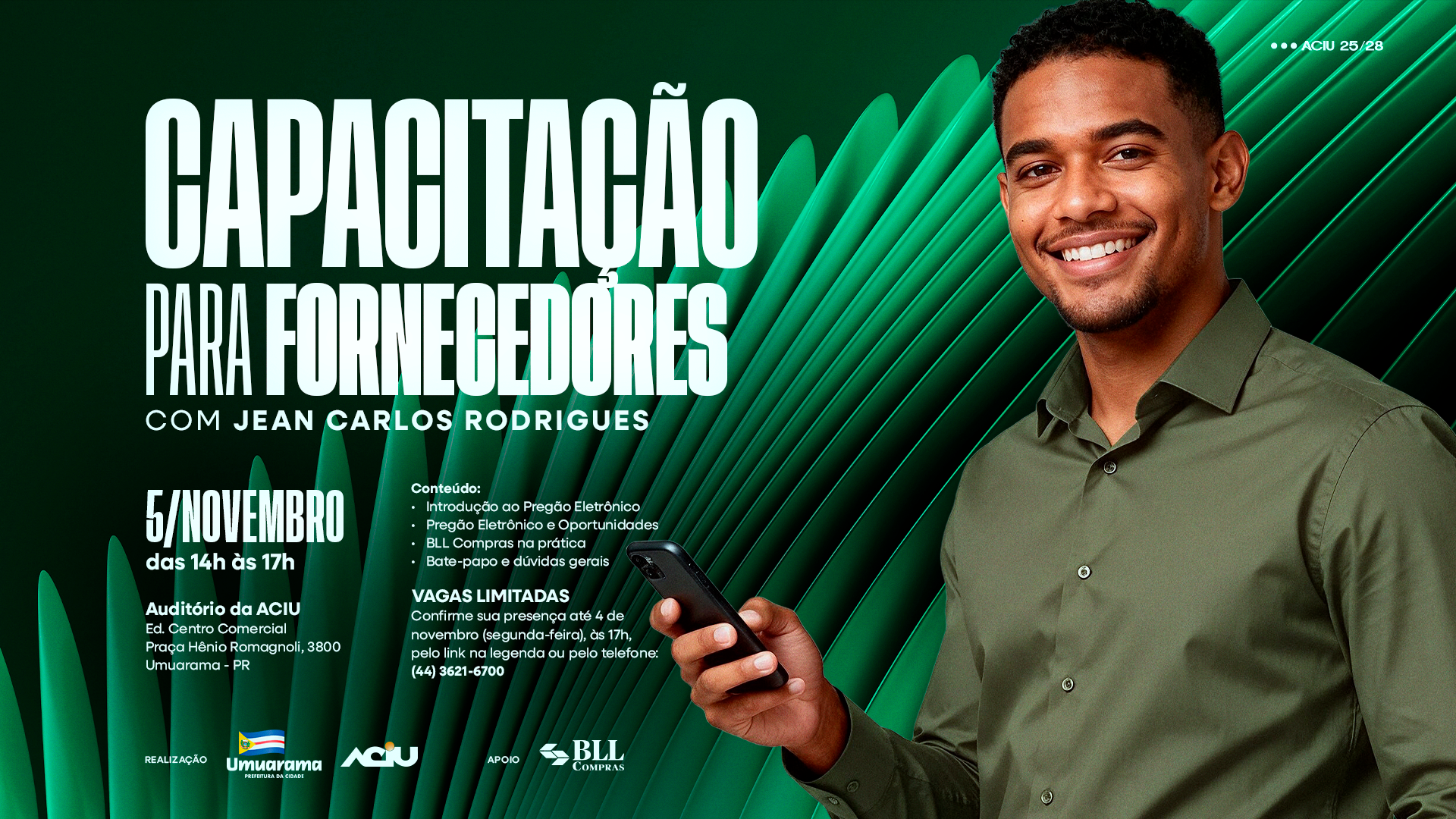 A Aciu (Associação Comercial, Industrial e Agrícola de Umuarama) com parceria da Prefeitura de Umuarama e a empresa BLL Compras, realizará uma capacitação exclusiva sobre pregão eletrônico e oportunidades de negócios com o setor público. O tema será abordado pelo especialista Jean Carlos Rodrigues.