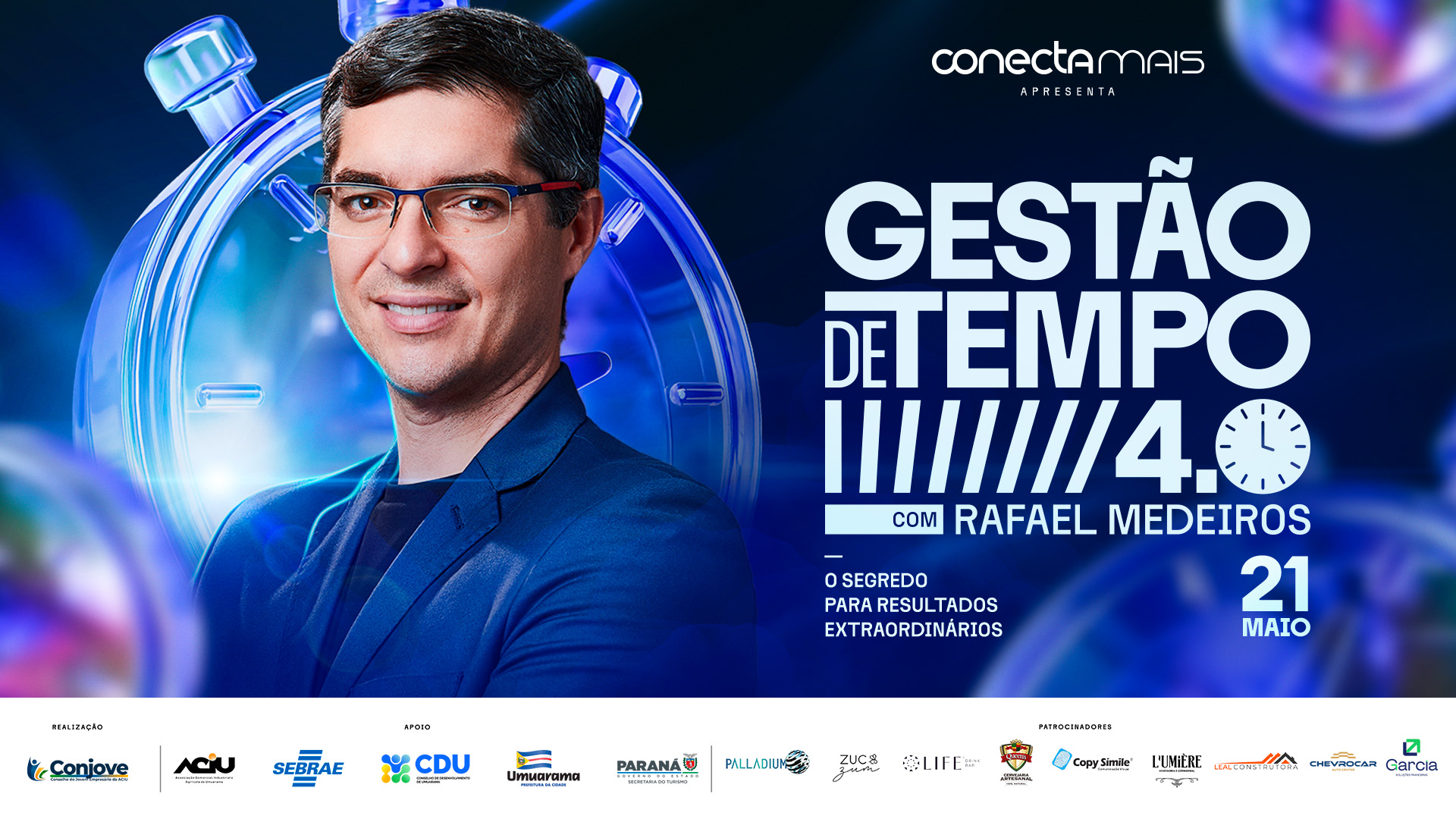 O Conecta Mais 2026 traz como palestrante Rafael Medeiros, especialista em produtividade e gestão do tempo, com atuação em todo o Brasil e palestras para mais de 500 mil pessoas. Durante a trajetória, ele já trabalhou com grandes organizações como Pfizer, Janssen, Porsche, Coca-Cola e Comitê Olímpico do Brasil.