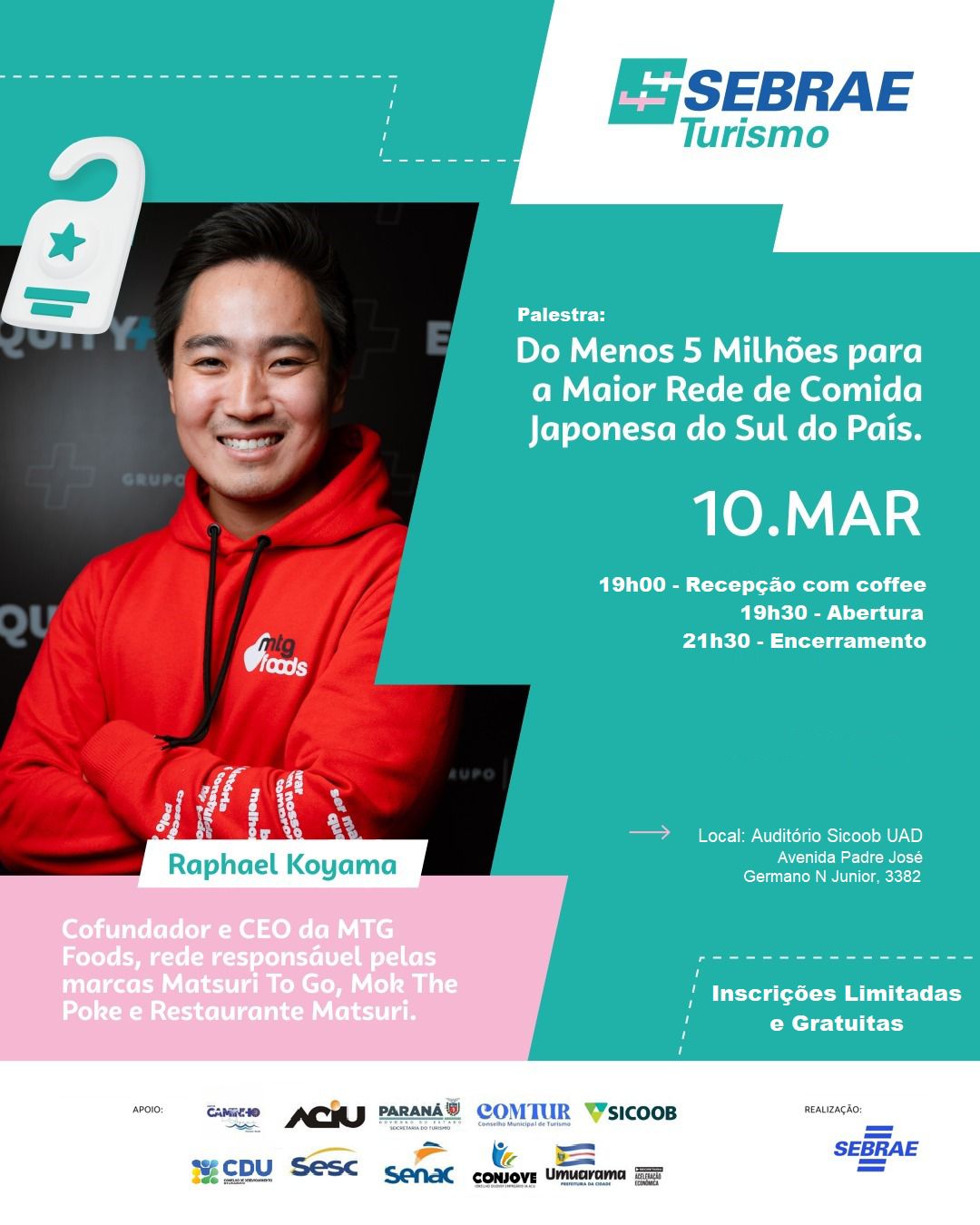 A programação contará com a presença do empresário Raphael Koyama, que compartilhará a trajetória no empreendedorismo com a palestra “Do menos 5 milhões para a maior rede de comida japonesa do Sul do país”. As inscrições são gratuitas e podem ser feitas por esse link. As vagas são limitadas.