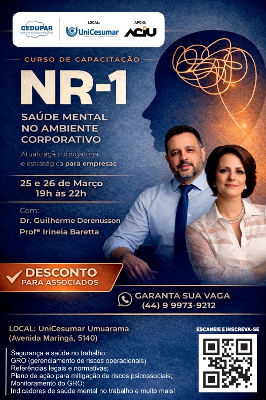 O Cedupar – Centro de Educação Paranaense vai realizar um curso de capacitação sobre a Norma Regulamentadora nº 1 (NR-1), na Unicesumar em Umuarama, nos dias 25 e 26 de março, das 19h às 22h.