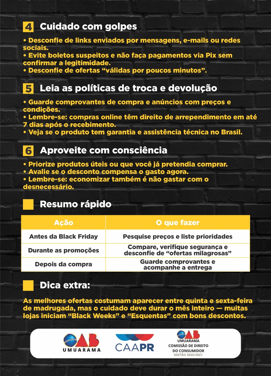 A Aciu (Associação Comercial, Industrial e Agrícola de Umuarama) firmou parceria com a OAB para divulgar esse material informativo entre os associados. Embora as maiores promoções da Black Friday estejam reservadas para o último fim de semana de novembro, ao longo do mês, muitas lojas oferecem descontos em diversos produtos.
