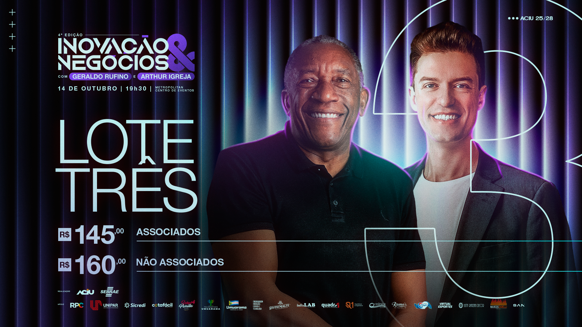 A Aciu segue com as vendas dos últimos ingressos para o Inovação & Negócios, um dos principais eventos que a entidade promove em parceria do Sebrae.Neste ano, dois grandes palestrantes, que têm ganhado destaque em todo o país, estarão presentes para uma noite que promete aos participantes uma experiência transformadora. Eles irão compartilhar trajetórias que servem de exemplo e apresentarão conteúdos práticos e que instigam na mudança de comportamentos.