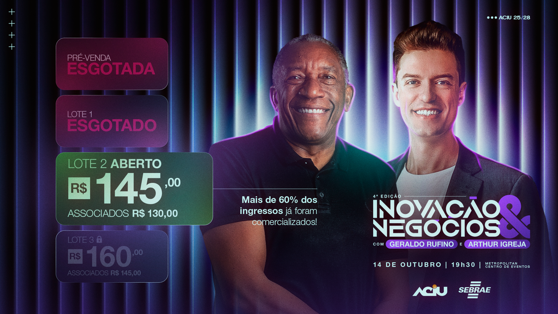 A Aciu esgotou os ingressos da pré-venda e pelo Lote 1 para a 4ª edição do Inovação & Negócios e segue com as vendas pelo Lote 2. O evento será realizado pela Aciu, em parceria do Sebrae-PR, no dia 14 de outubro, às 19h30, no Metropolitan Centro de Eventos.