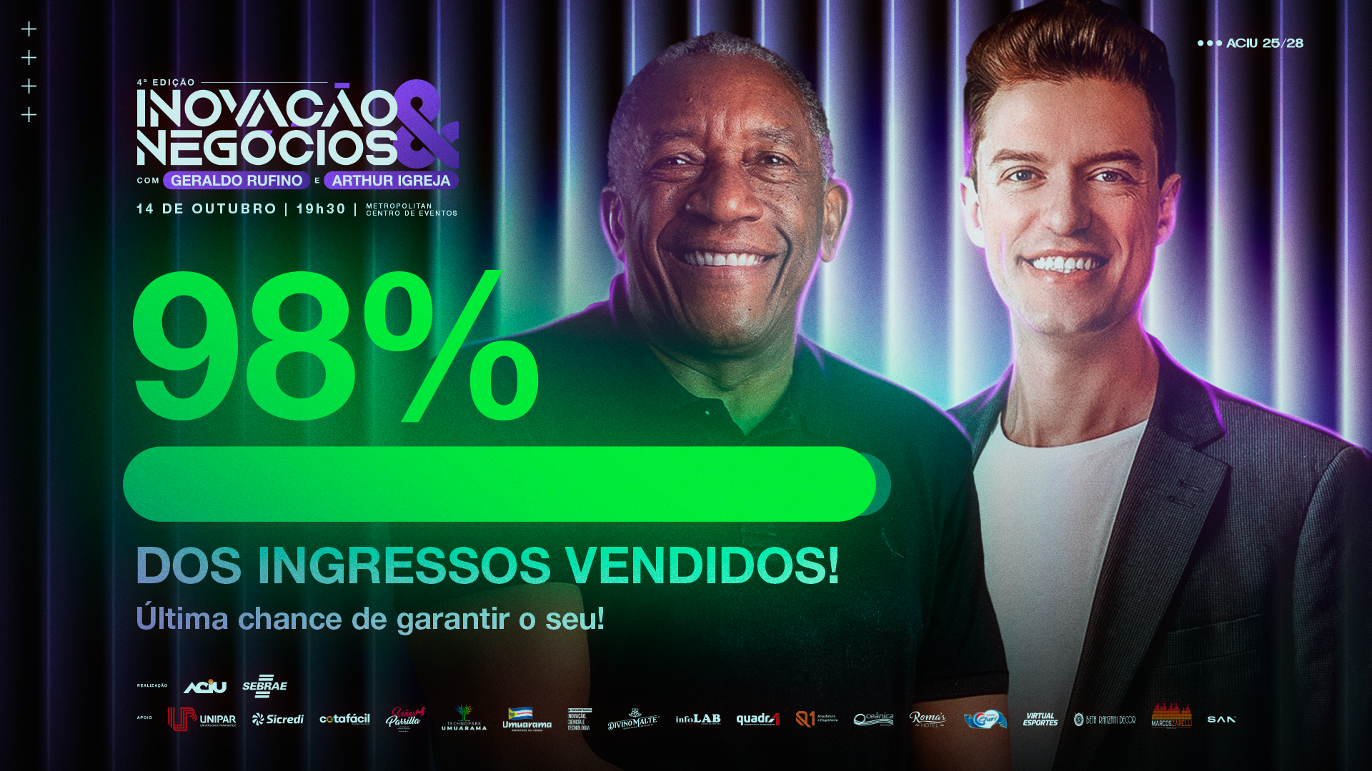 A Aciu (Associação Comercial, Industrial e Agrícola de Umuarama), em parceria do Sebrae, realizará nesta terça-feira (14), a 4ª edição do Inovação & Negócios, no Metropolitan Centro de Eventos, às 19h30.