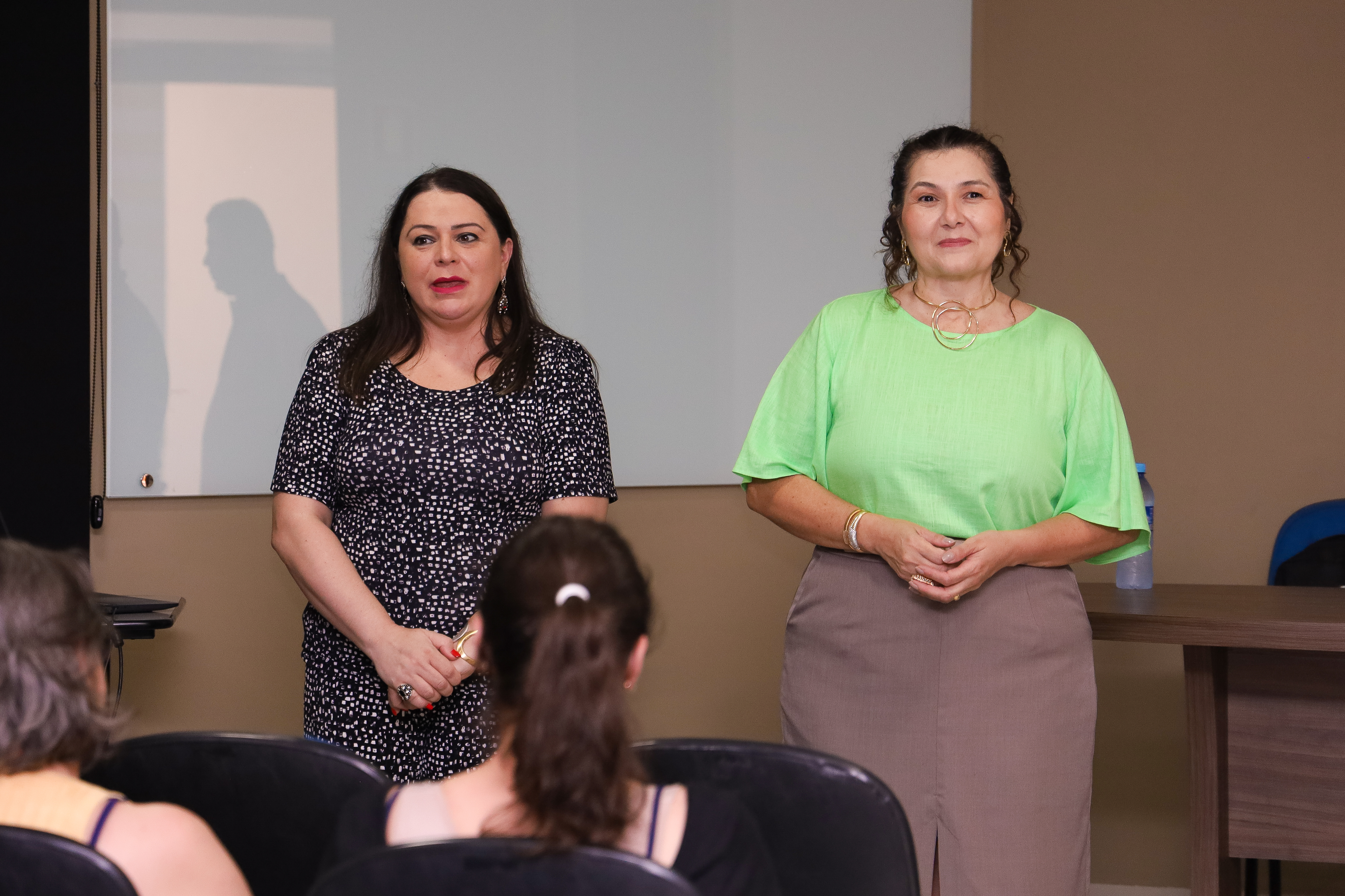 A presidente da Aciu, Carla Frasquette, ao lado da responsável pelo Escritório de Compras da Aciu, Sílvia Horwat, recebeu os convidados e deixou uma mensagem de incentivo para que aproveitassem ao máximo o momento para receberem novos conhecimentos.