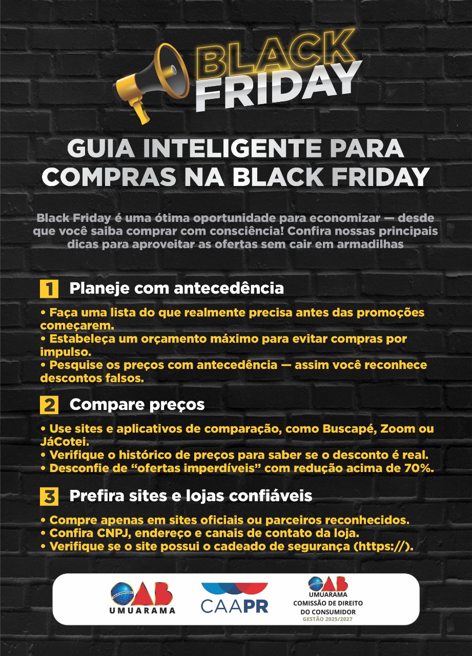 A OAB (Ordem dos Advogados do Brasil), subseção de Umuarama, por meio da comissão de Direito do Consumidor, produziu um guia inteligente para ajudar a população nas compras na Black Friday.